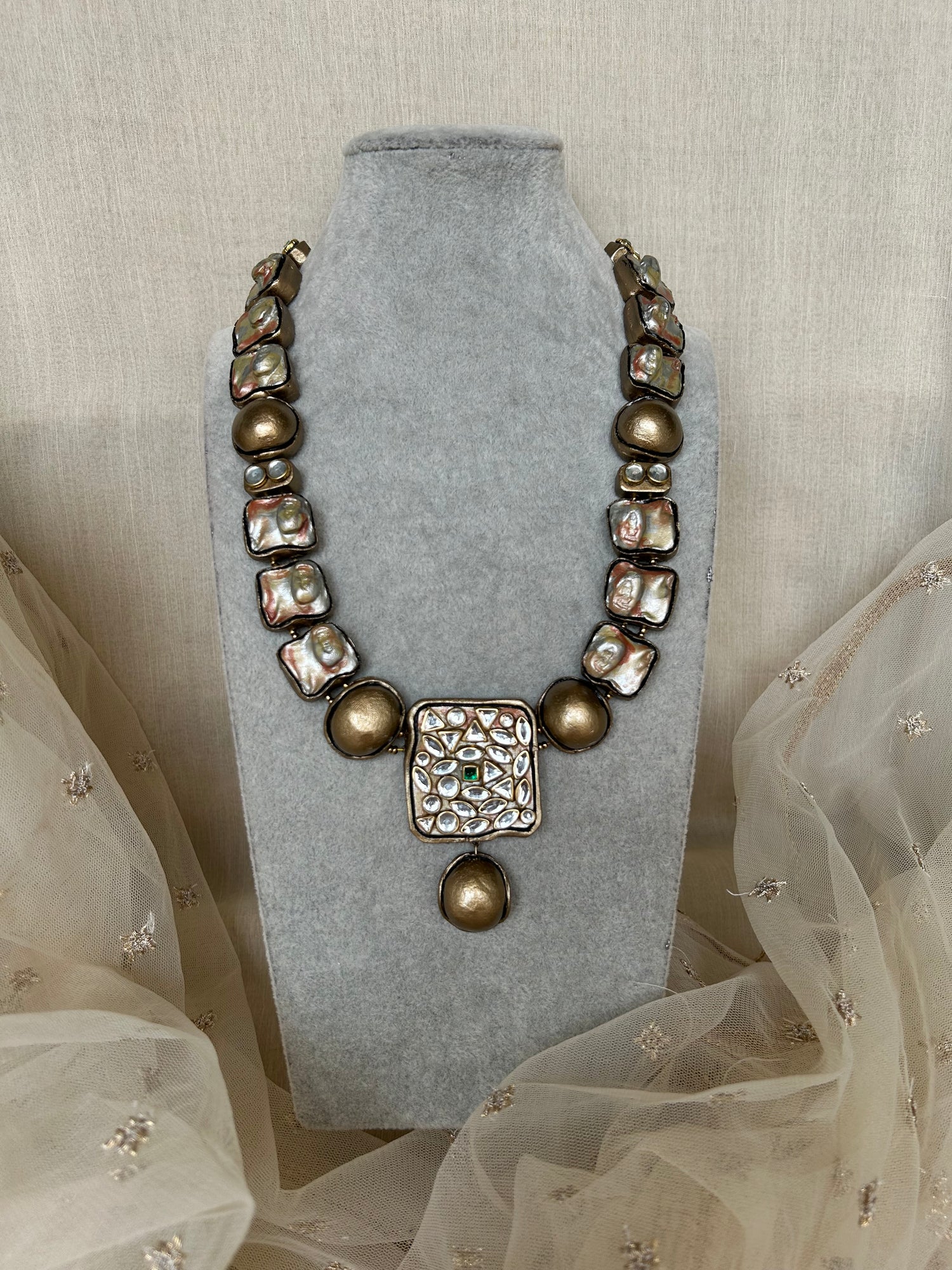 Handcrafted Terracotta Necklace Set in Antique Gold & Silver | Kundan-Embellished Statement Jewelry with Earrings – Shika