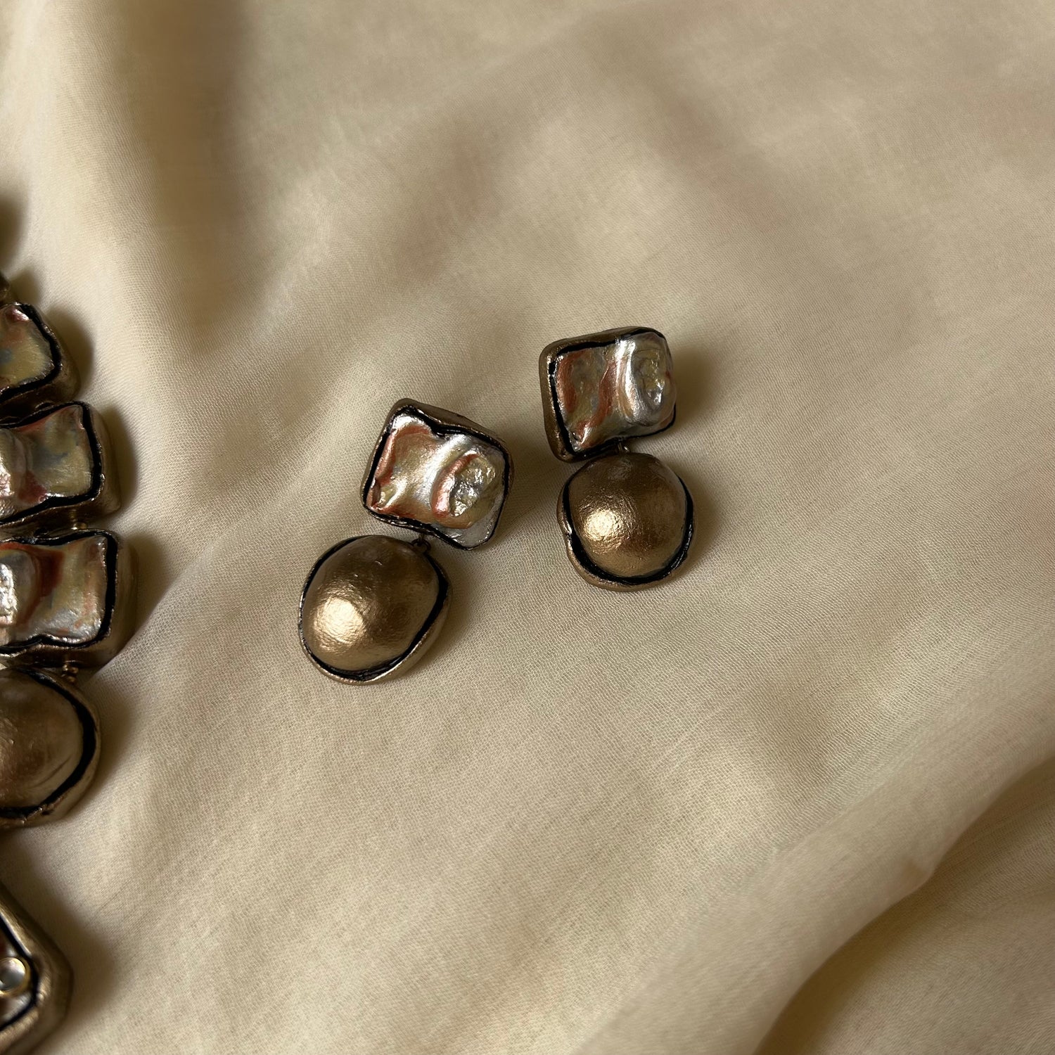A truly regal piece crafted for those who love bold, artistic jewelry — this handmade terracotta necklace set from Shika features a stunning blend of antique gold and silver tones.
