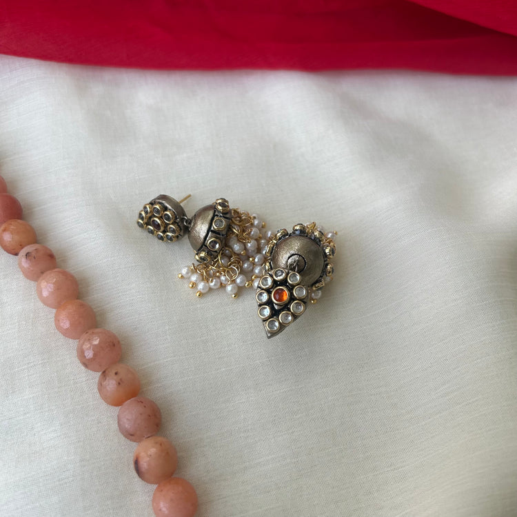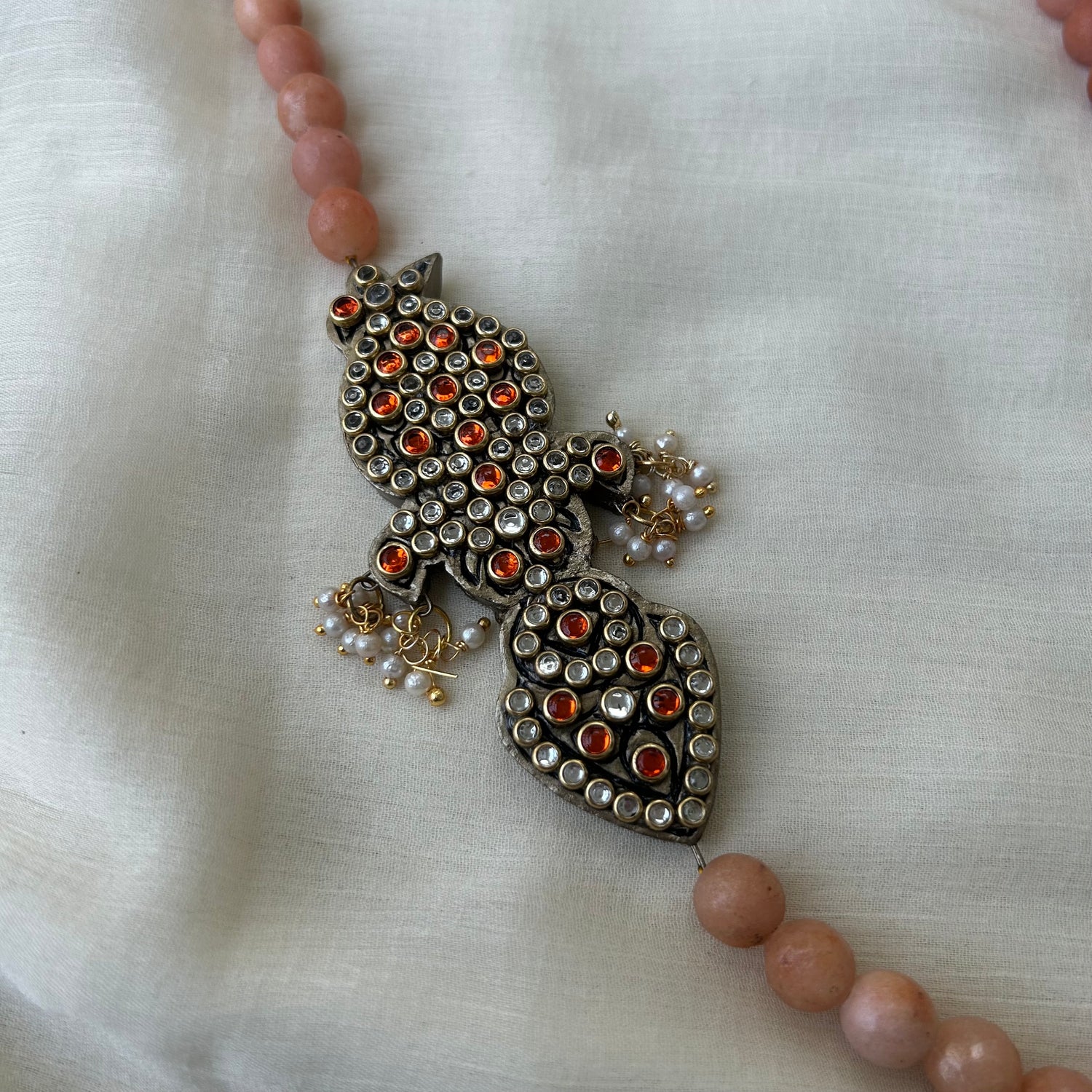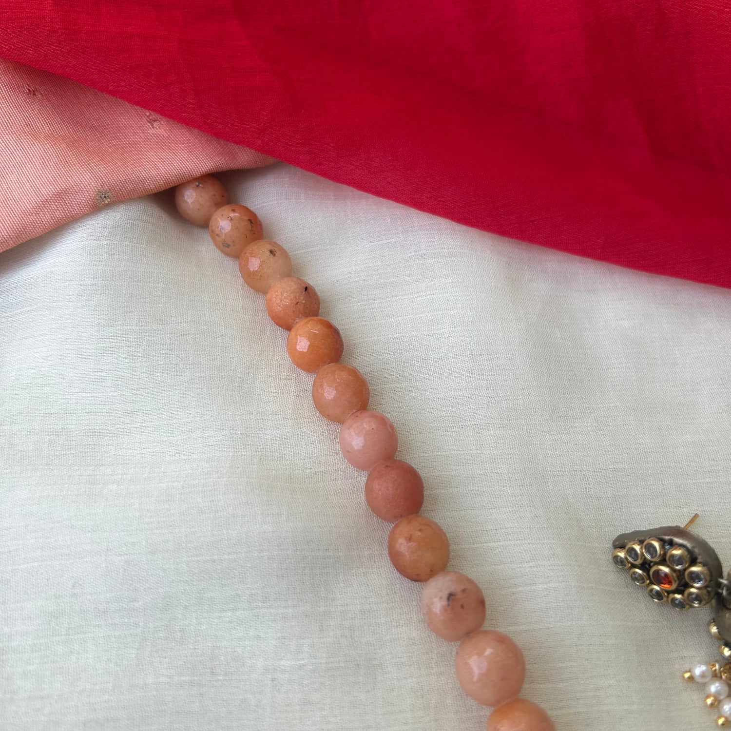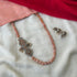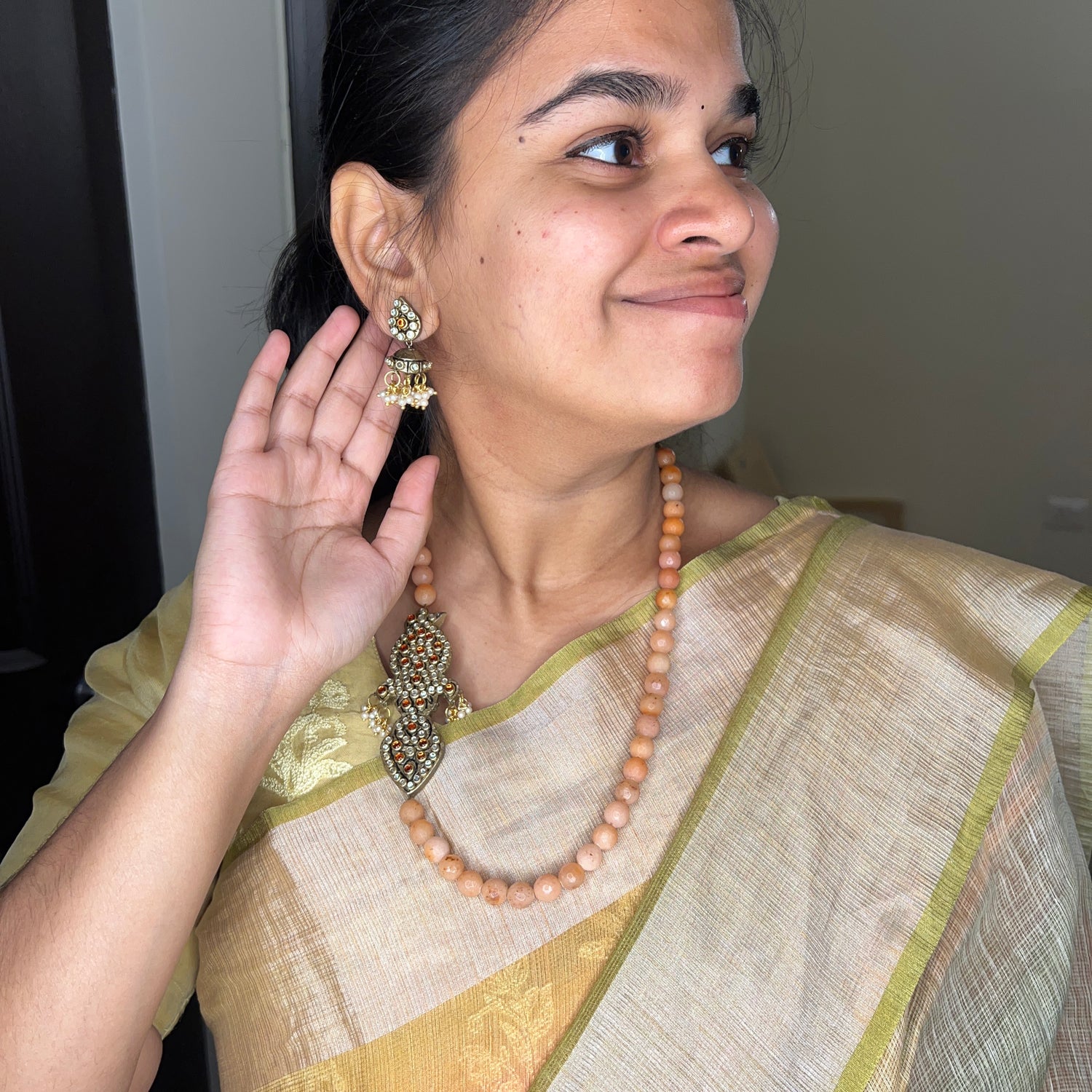 The soft peach-toned beads create a refined, understated look, while the ornate terracotta pendant adds a touch of heritage charm. Paired with classic jhumka earrings featuring delicate pearl accents, this set strikes the perfect balance between contemporary elegance and traditional beauty.