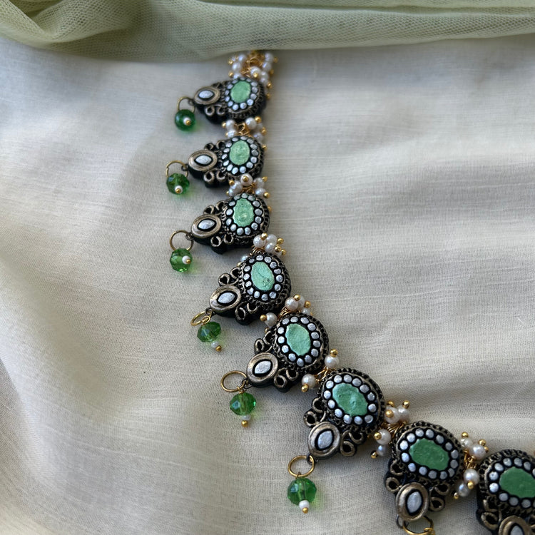 Handmade Terracotta Jewellery Necklace Set with Green Crystal Bead Drops & Pearl Detailing | Traditional Indian Design