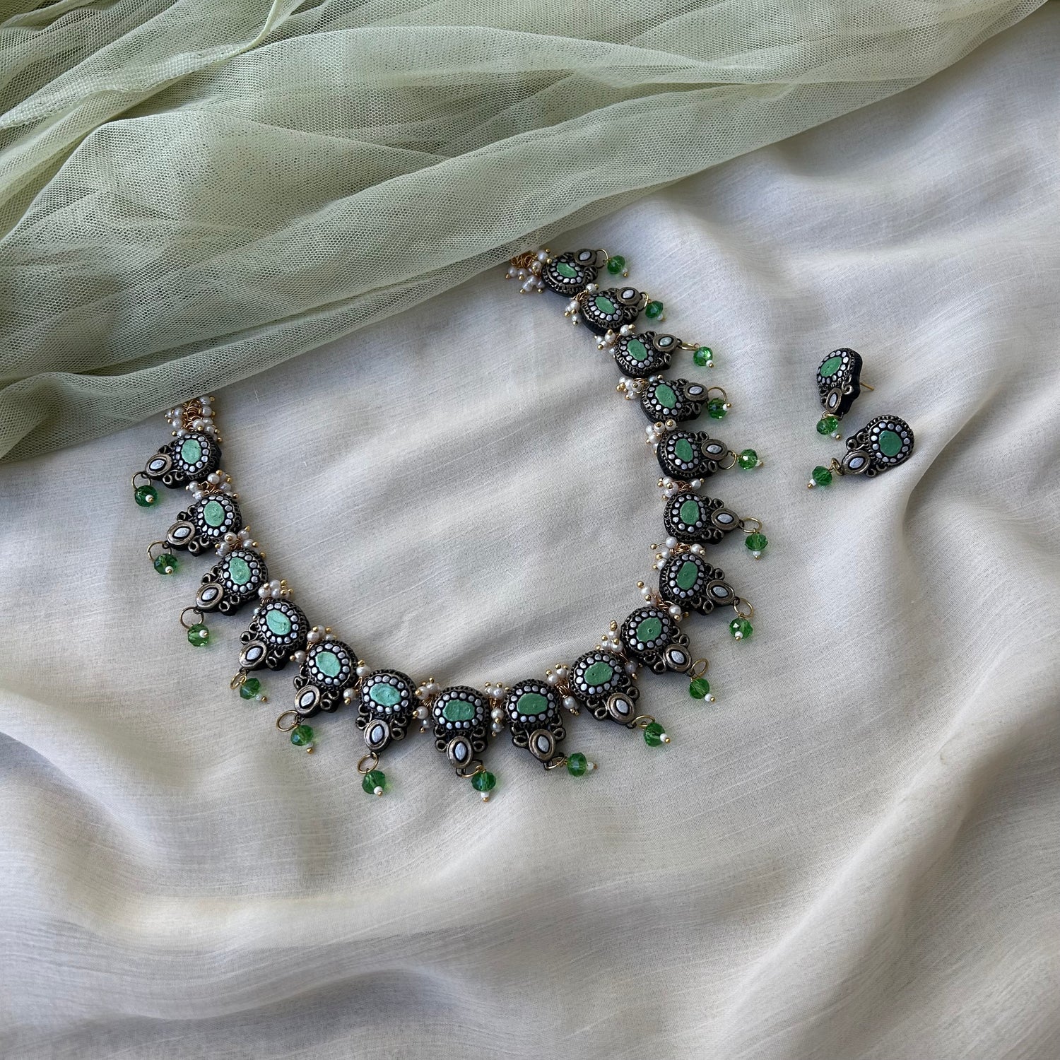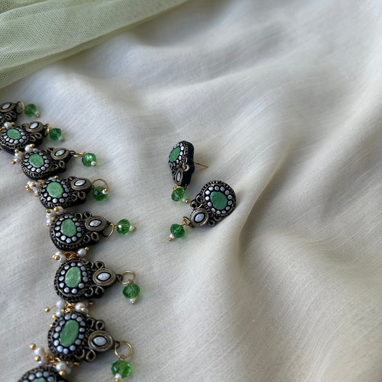 Handmade Terracotta Jewellery Necklace Set with Green Crystal Bead Drops