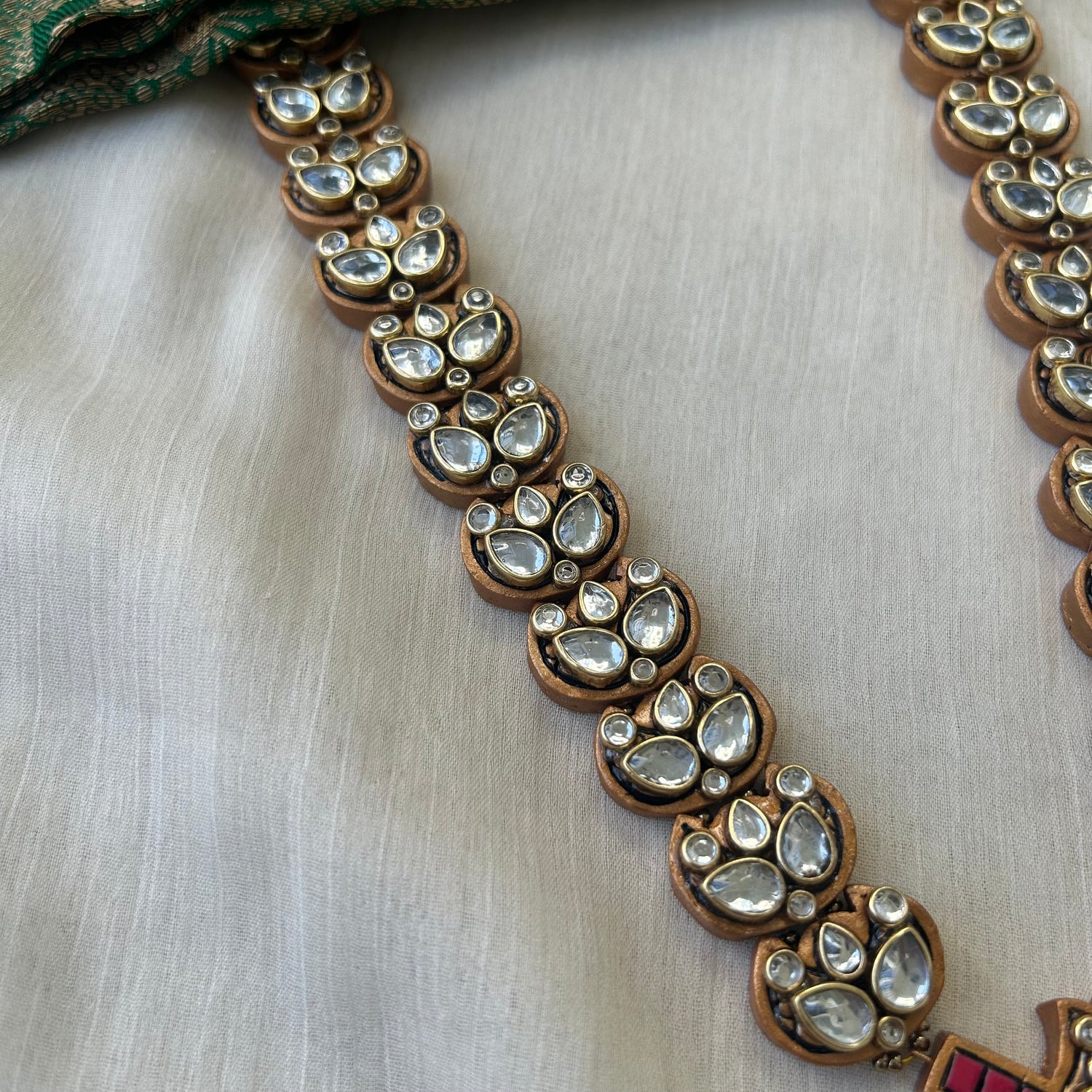 Each terracotta element is carefully hand-shaped and adorned with shimmering white Kundan stones that gently catch the light, adding sophistication without overpowering the design. The soft contrast of earthy terracotta, luminous white Kundans, and the deep green glass finish creates a truly elegant and refined look.