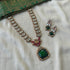 The highlight of this piece is its stunning terracotta pendant, where the central green section is hand-painted with glass green colour, giving it a rich, glossy finish and a beautiful depth of tone. This subtle glass effect adds a modern touch while keeping the jewellery rooted in traditional aesthetics.