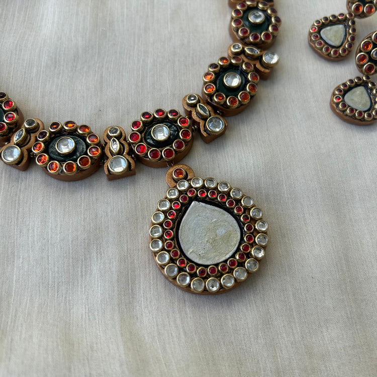 Handmade Terracotta Jewellery Necklace Set with Red & Orange Stone Embellishments