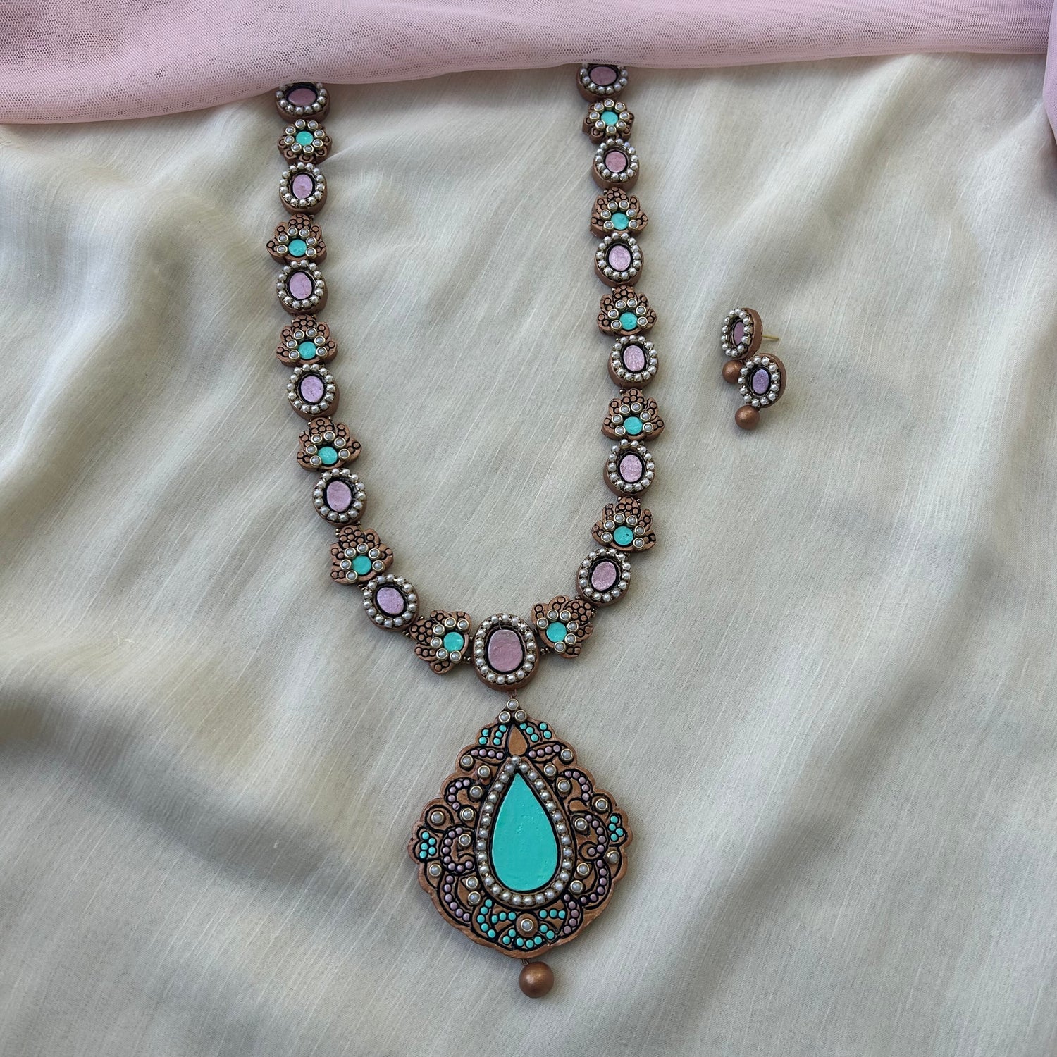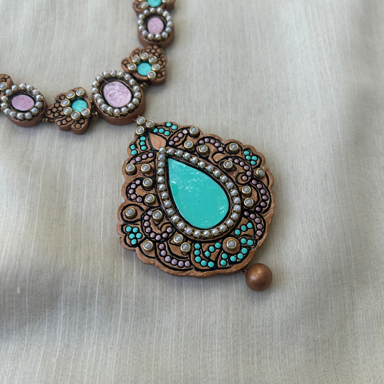 Soft, graceful and quietly striking — this handmade terracotta necklace set is designed in a beautiful blend of pastel pink and pastel blue shades, delicately embellished with sparkling Kundan stones.