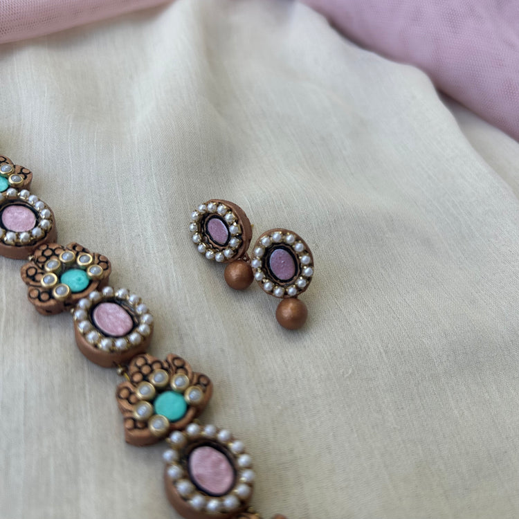 Pastel Pink and blue Terracotta Necklace Set with Kundan Stones