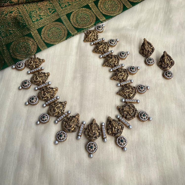 About the Product: This delicate piece of Shika is handcrafted to perfection.Your every moment deserves an elegance and we tune in. Terracotta Ganesh neckwear with studs in the endless green and gold shades.The neckwear comes with adjustable thread for the closure.