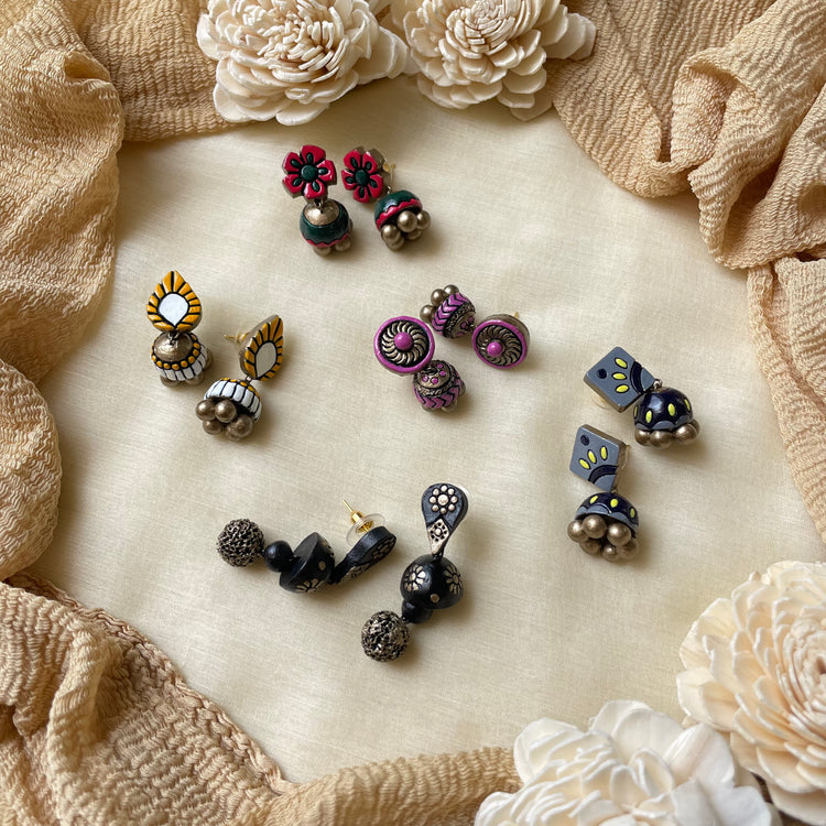 About the Product: You must not be afraid to sparkle a little brighter, Darling! Shika handcrafts the terracotta jhumkas with care and perfection. Terracotta jhumkas assorted set of 5 in stunning shades and patterns.