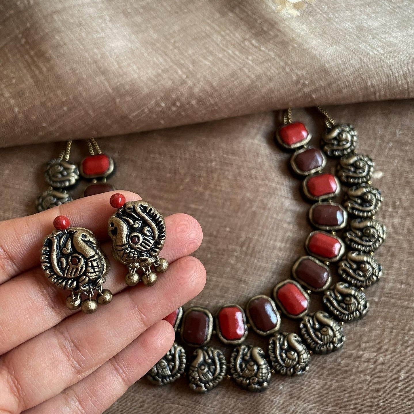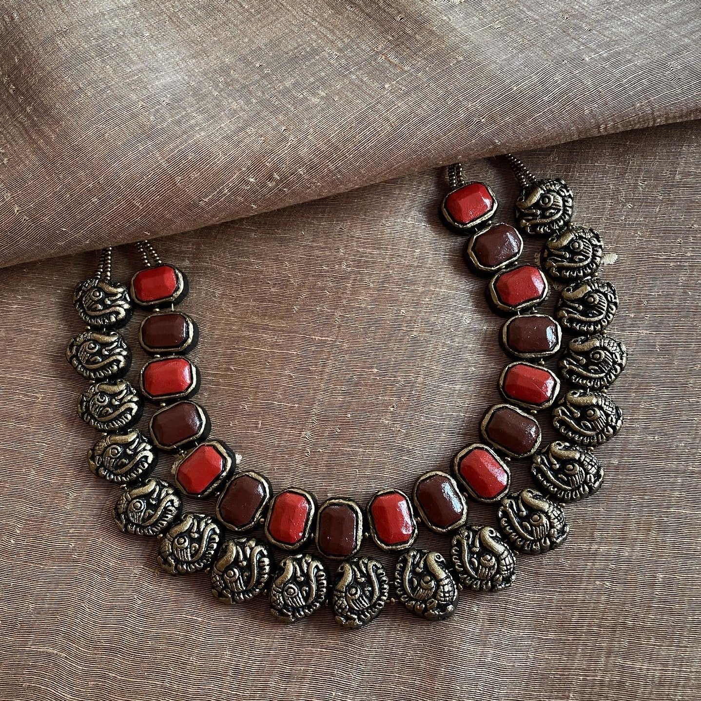 About the Product:This delicate piece of Shika is handcrafted to perfection. Your every moment deserves an elegance and we tune in. Terracotta two layered neckwear with studs in rustic shades. The neckwear comes with adjustable dori for the closure.