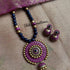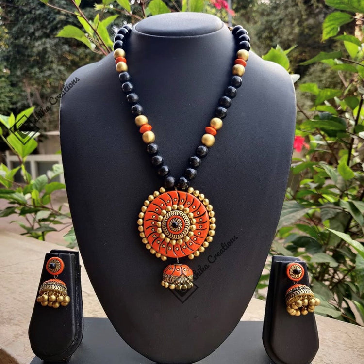 About the Product: This delicate piece of Shika is handcrafted to perfection. Your every moment deserves an elegance and we tune in. Terracotta neckwear and jhumkas with an indo contemporary touch. The neckwear comes with an adjustable dori for the closure.