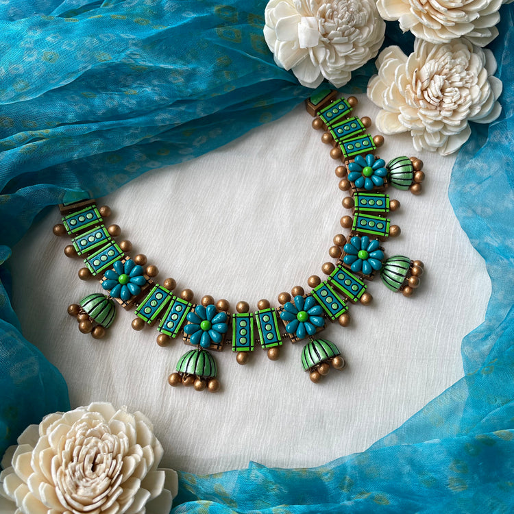 About the Product: This delicate piece of Shika is handcrafted to perfection. Your every moment deserves an elegance and we tune in. Terracotta neckwear with jhumkas in stunning teal and green hues. The neckwear comes with an adjustable dori for the closure.