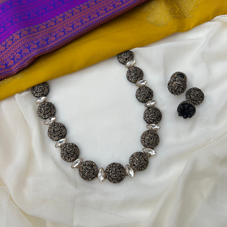About the Product: This delicate piece of Shika is handcrafted to perfection.Your every moment deserves an elegance and we tune in. Terracotta neckwear with jhumkas stunning black, red and gold shades The neckwear comes with adjustable dori for the closure.