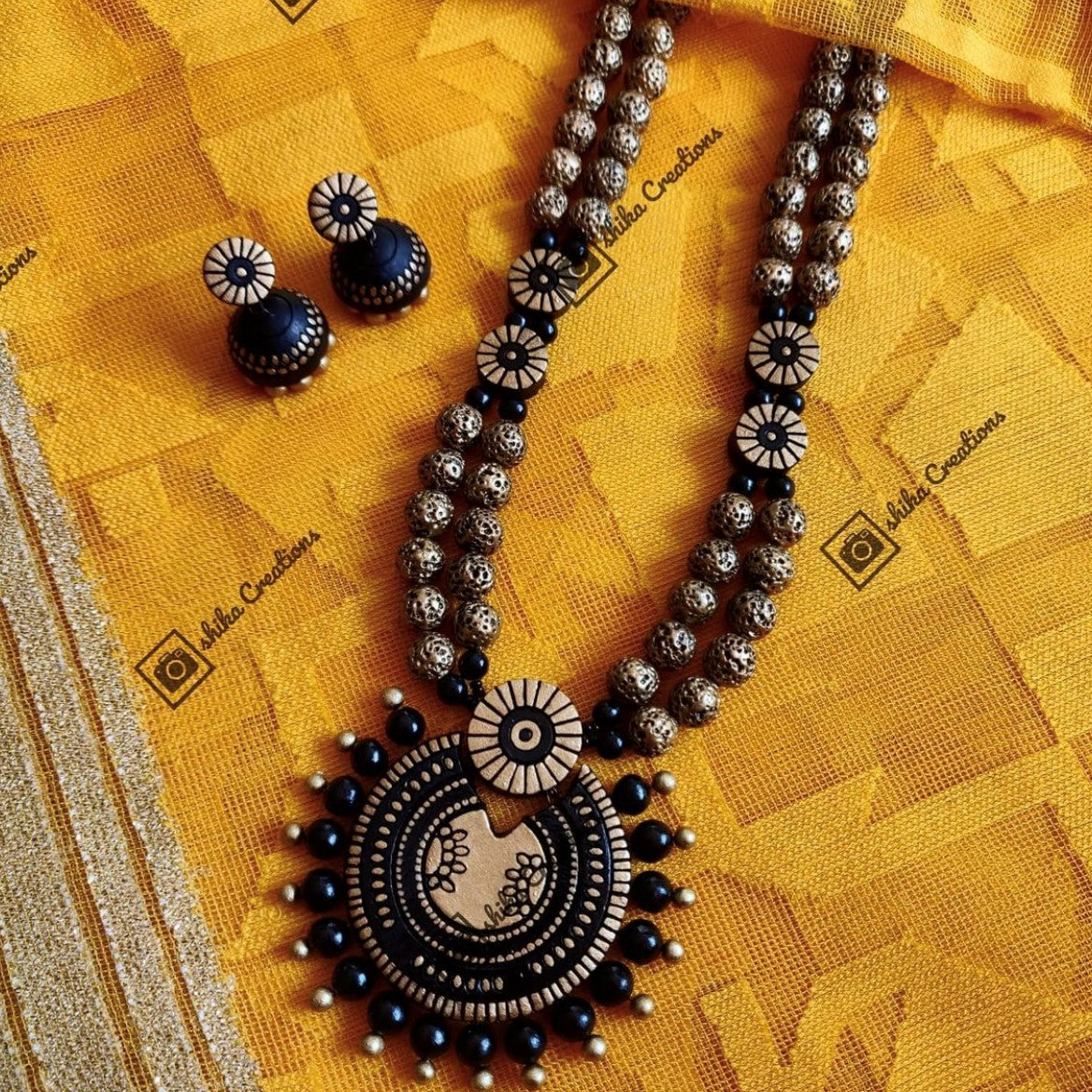 About the Product: This delicate piece of Shika is handcrafted to perfection. Your every moment deserves an elegance and we tune in. Terracotta neckwear with jhumkas in the most favourite black and gold combination. The neckwear comes with an adjustable dori for the closure.