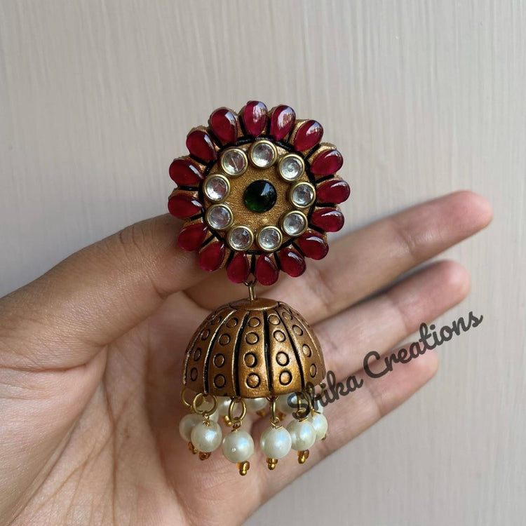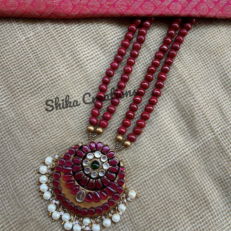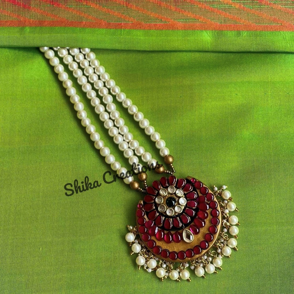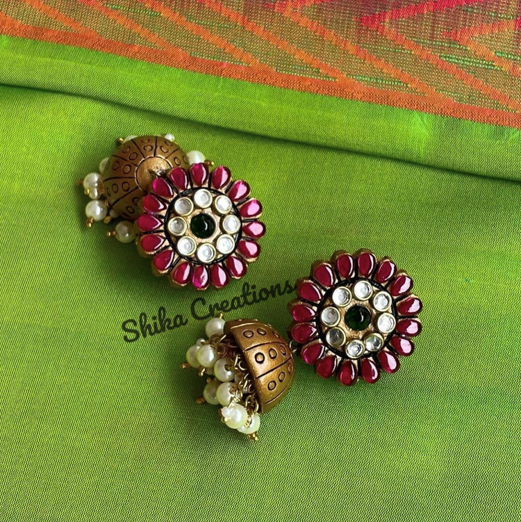 About the Product: Shika blended terracotta with kemp stones to get a brilliant new look for your outfit. Kemp stones are semi-precious stones and they dazzle in bright ambiance. What makes this more special is that this is completely handcrafted. Terracotta neckwear and huge dangling jhumkas with kemp stone embellishments and dangling pearls. The neckwear comes with an adjustable chain for the closure.