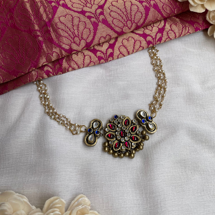 About the Product: Shika blended terracotta with kundhans to get a new stunning look for your outfit. What makes this more special is that this is completely handcrafted. Terracotta choker and studs with kundhan stone embellishments sprinkled with terracotta loreals. The neckwear comes with adjustable chain for the closure.