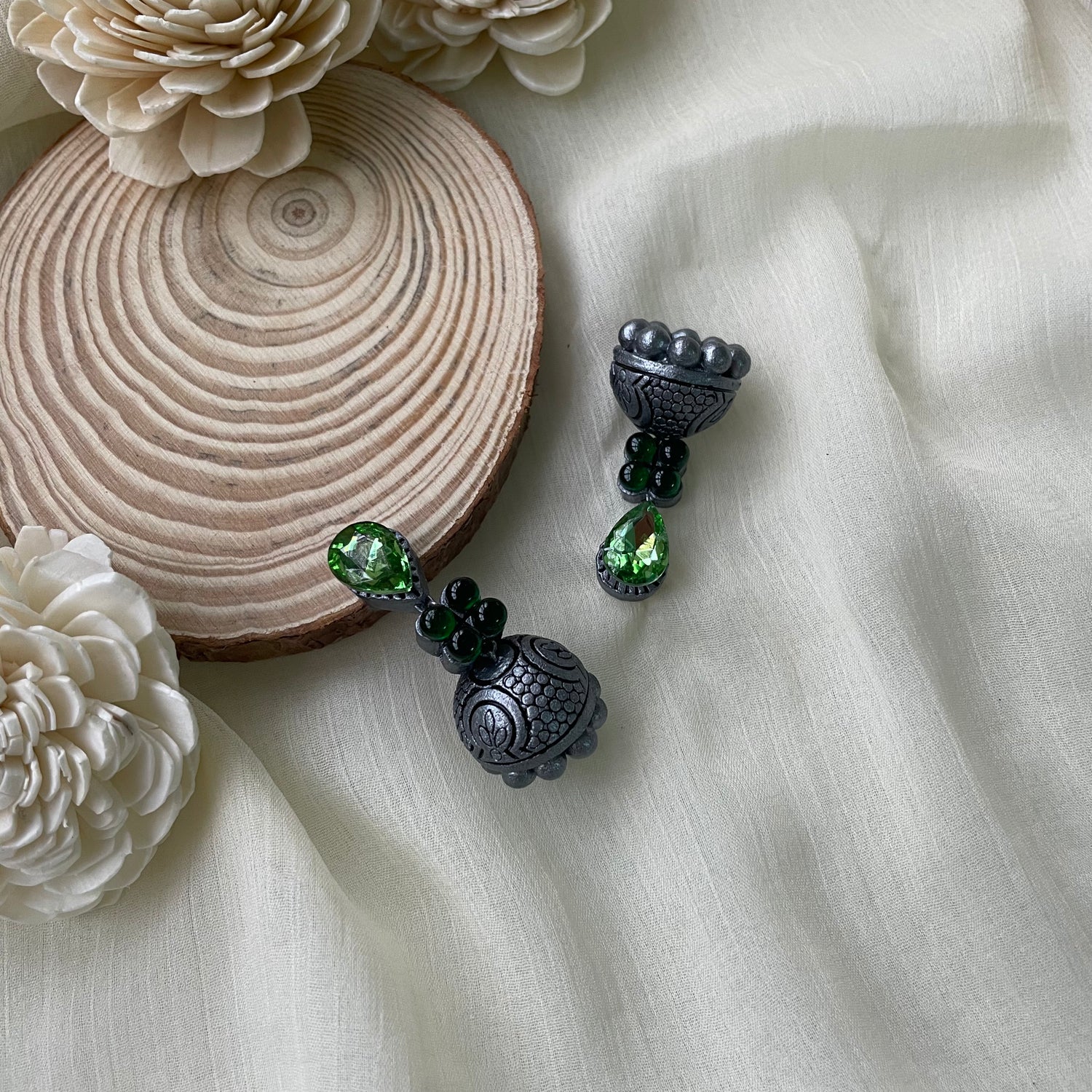 About the Product: You must not be afraid to sparkle a little brighter, darling! Shika handcrafts the terracotta jhumkas with care and perfection. Terracotta jhumkas painted in silver and embellished with artificial stones and kemp stones.