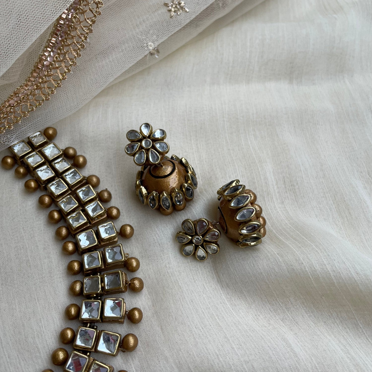 This handcrafted terracotta choker necklace set is beautifully adorned with classic Kundan stone embellishments, arranged in a refined geometric pattern that gives the piece a rich, royal appeal. Made entirely from natural terracotta, it offers the grandeur of traditional jewellery while remaining lightweight and comfortable to wear.