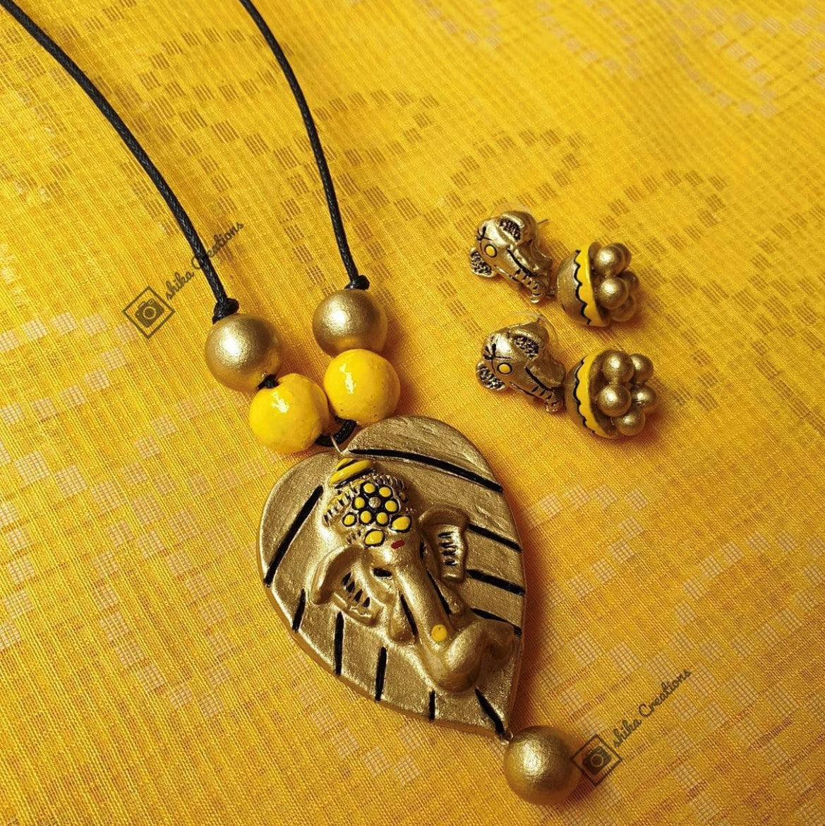 About the Product: Shika's regular wear sets are simple, goes with everything, and can be worn every day to get a sophisticated look. Terracotta pendant with jhumkas in spring shades. The neckwear comes with an adjustable dori for the closure.