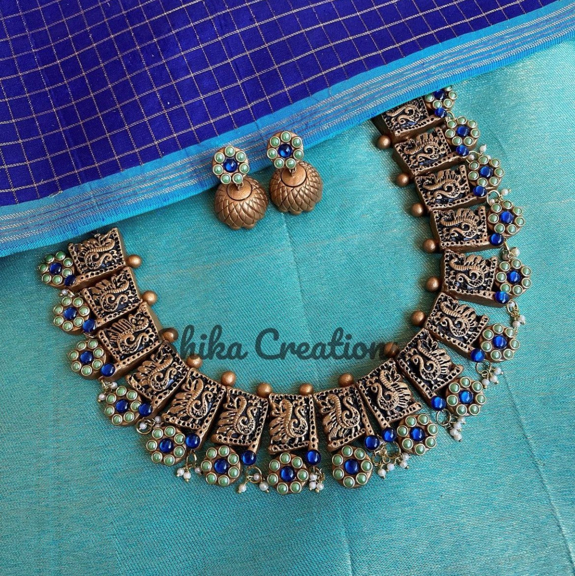 About the Product: Shika blended terracotta with kundhans to get a new stunning look for your outfit. What makes this more special is that this is completely handcrafted. Terracotta neckwear and jhumkas with vibrant kundhan stone embellishments. The neckwear comes with an adjustable chain for the closure.