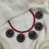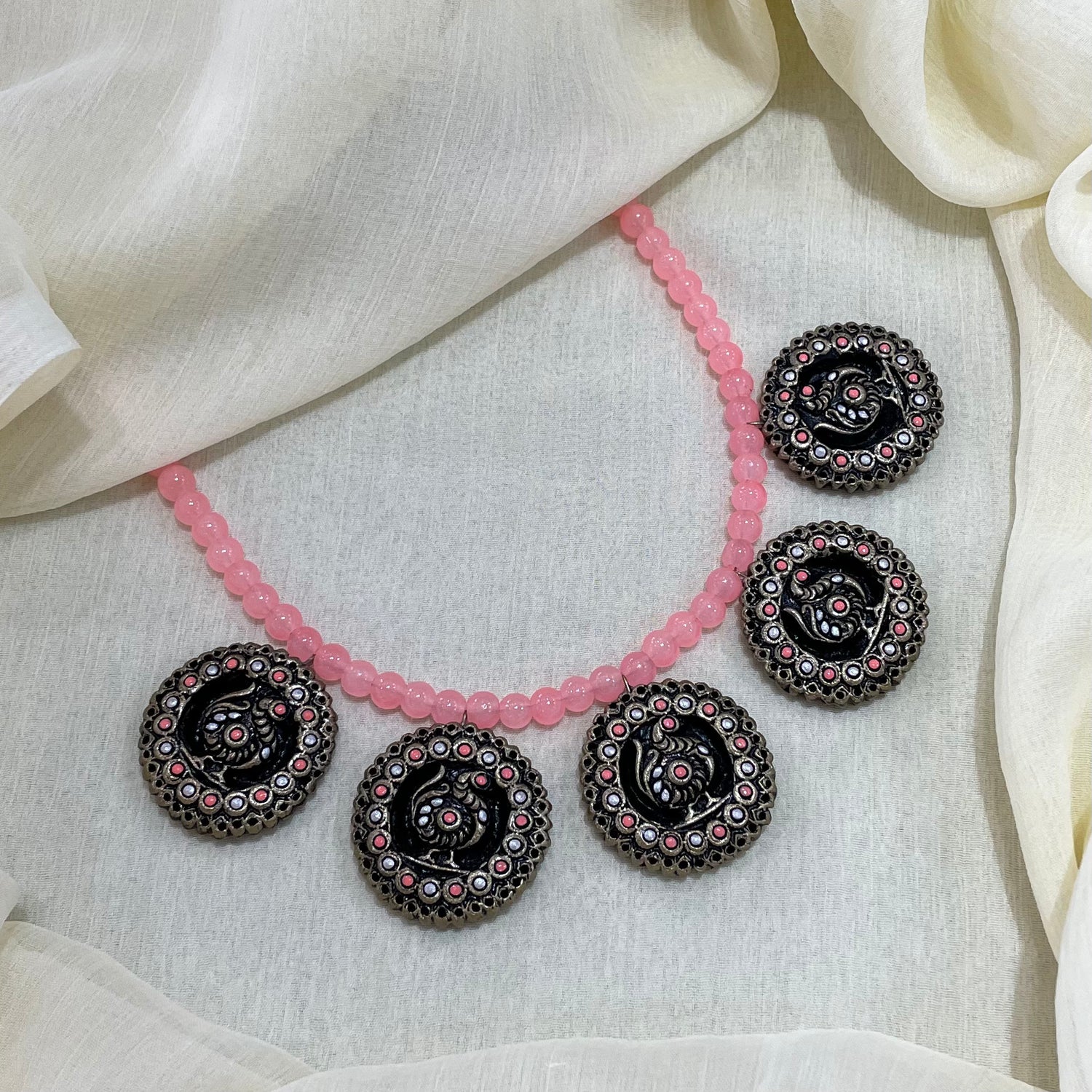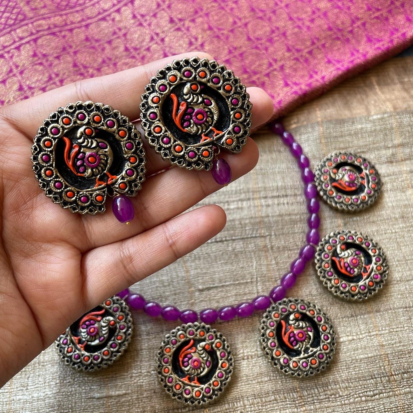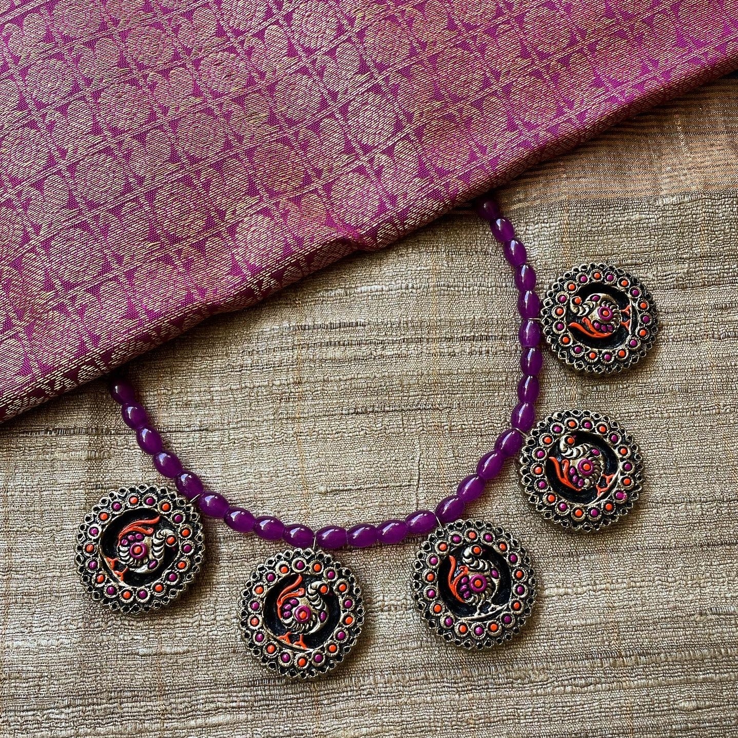About the Product: This delicate piece of Shika is handcrafted to perfection.Your every moment deserves an elegance and we tune in. Terracotta peacock neckwear and studs chilling in purples. The neckwear comes with adjustble dori for the closure.