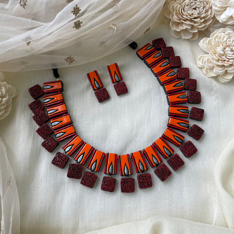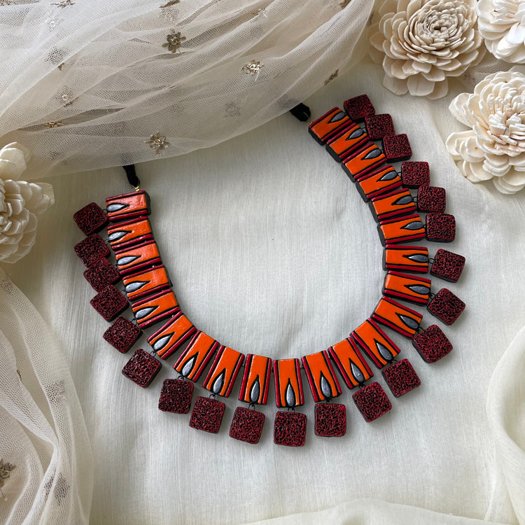 About the product - Signatures of Shika! Terracotta neckwear in the shades of red and orange. It is paired with danglers. The set comes with an adjustable thread for the closure.